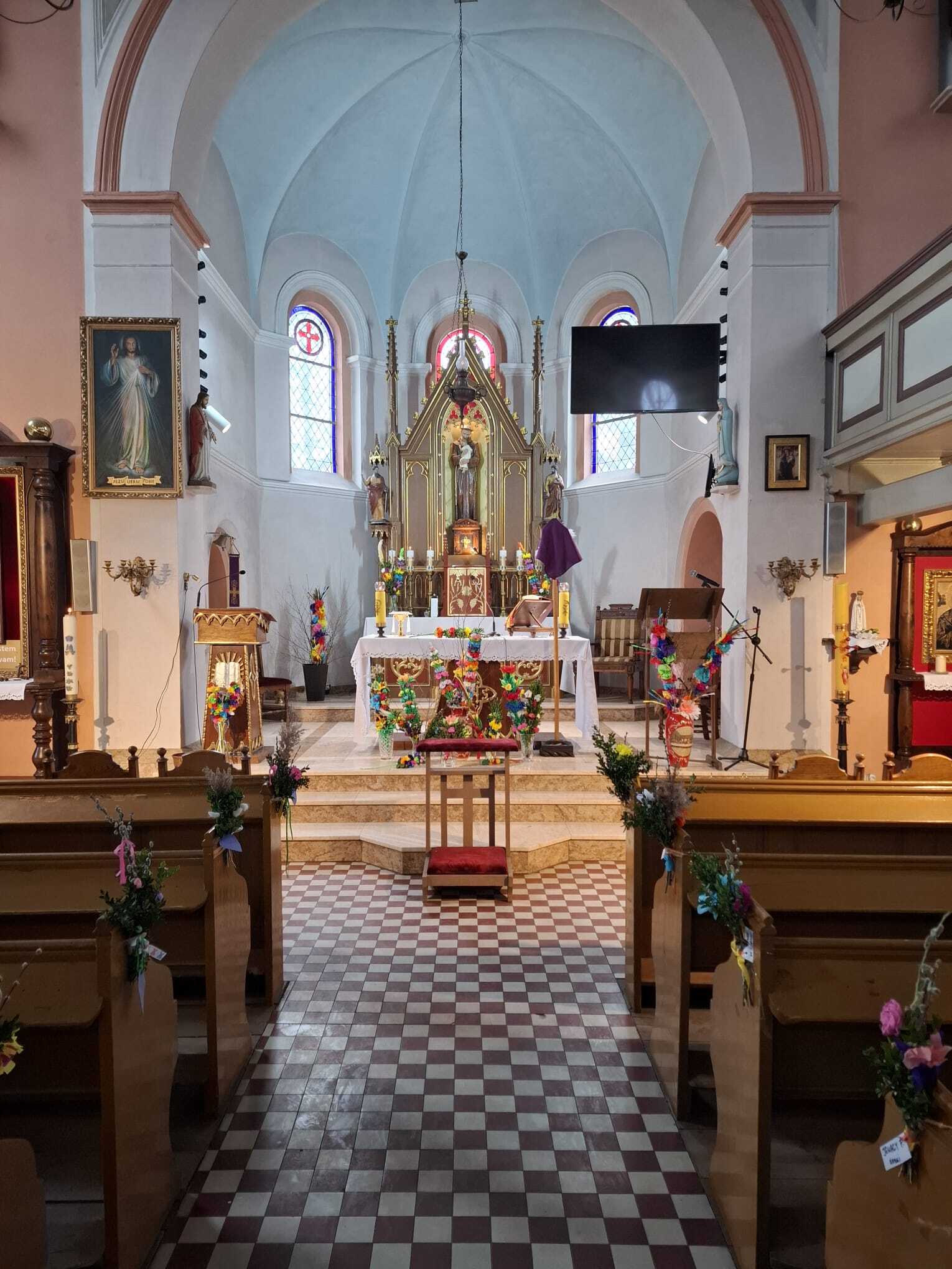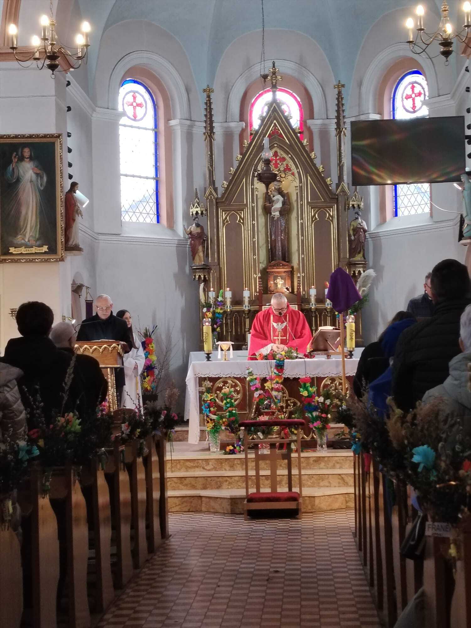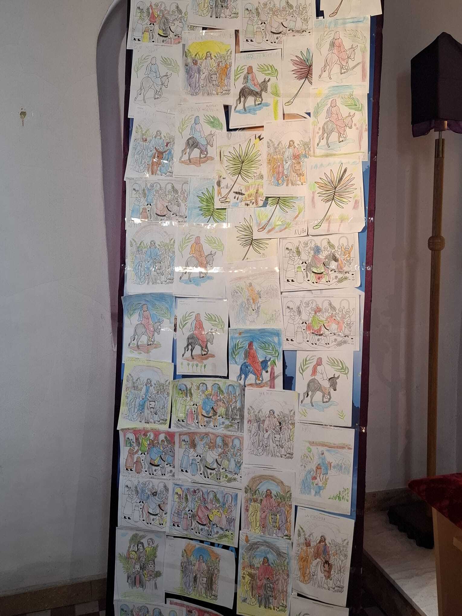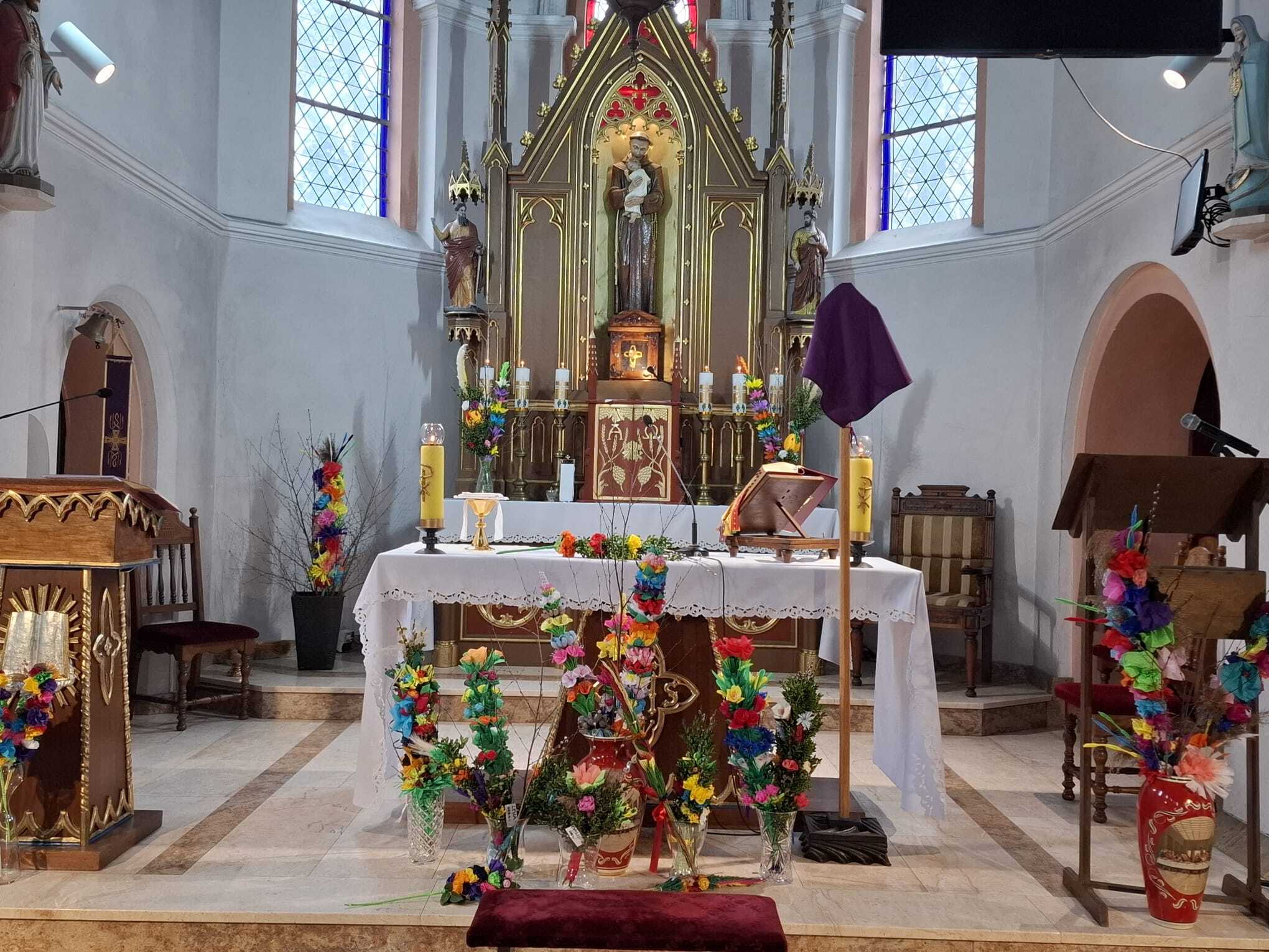 Niedziela Palmowa w Grabównie zgromadziła licznych wiernych, którzy przybyli do kościoła parafialnego, by wspólnie rozpocząć Wielki Tydzień. Uroczystości rozpoczęły się od poświęcenia palm – symbolu odradzającego się życia oraz radosnego powitania Jezusa w Jerozolimie. Kolorowe, ręcznie wykonane palmy, przygotowane przez całe rodziny, a także przez dzieci wraz z paniami z naszego przedszkola w Grabównie z grup "Żabki" i "Biedronki", nadały wydarzeniu wyjątkowy, lokalny charakter. Dzieci z przedszkola w Miasteczku Krajeńskim z grup „Tygryski” i „Motylki” pięknie pokolorowały obrazki przedstawiające palmy oraz wjazd Jezusa do Jerozolimy, które również przyozdobiły nasz kościół. W trakcie mszy świętej odczytano opis Męki Pańskiej, wprowadzając wiernych w refleksyjny nastrój nadchodzących dni. Wierni wzięli również udział w uroczystej procesji wokół kościoła, niosąc palmy i wspólnie śpiewając pieśni religijne. Atmosfera skupienia i wspólnoty przypomina o znaczeniu duchowego przygotowania do Świąt Wielkanocnych.